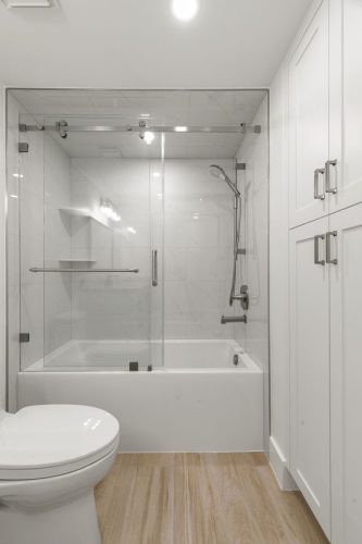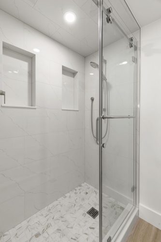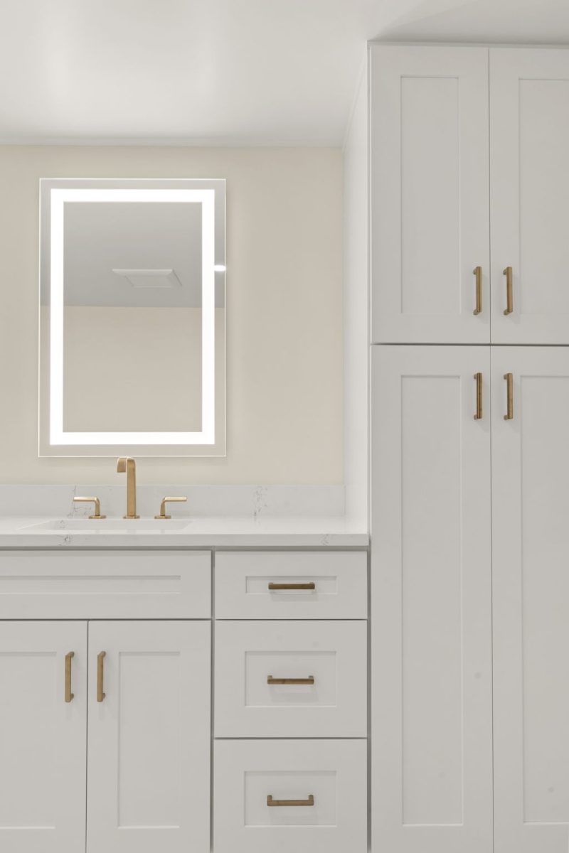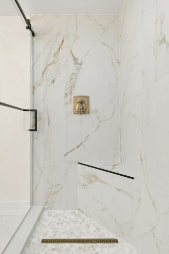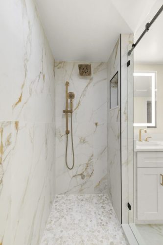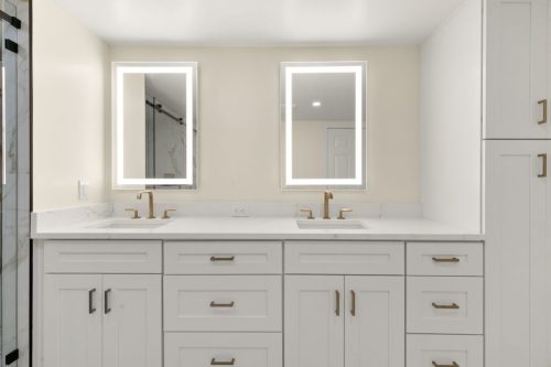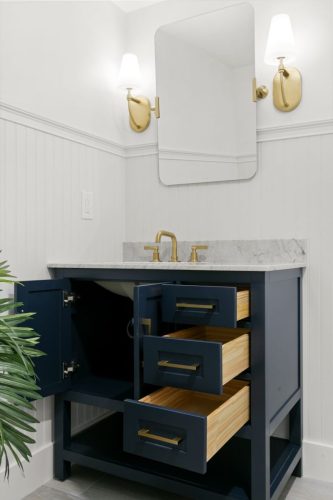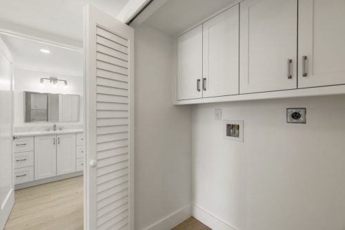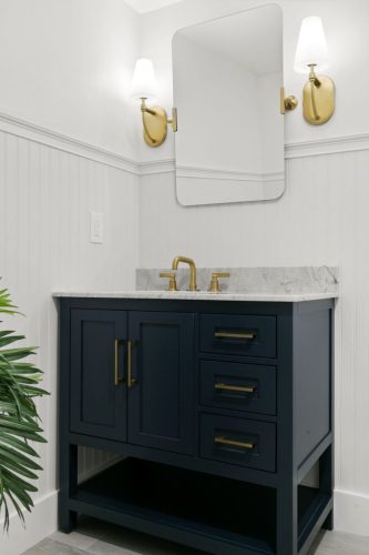 The Duchess Remodel highlights refined coastal design through its updated master bath, bar, and powder room. The master bath was transformed into a calm, spa-like retreat featuring soft neutral tones, custom cabinetry, and a freestanding tub accented by polished fixtures and elegant tilework. The bar area combines functionality and style, with built-in shelving, warm wood accents, and subtle lighting that complements the overall flow of the space. The powder room showcases thoughtful details and a timeless design, balancing sophistication and simplicity to create a welcoming impression for guests.
